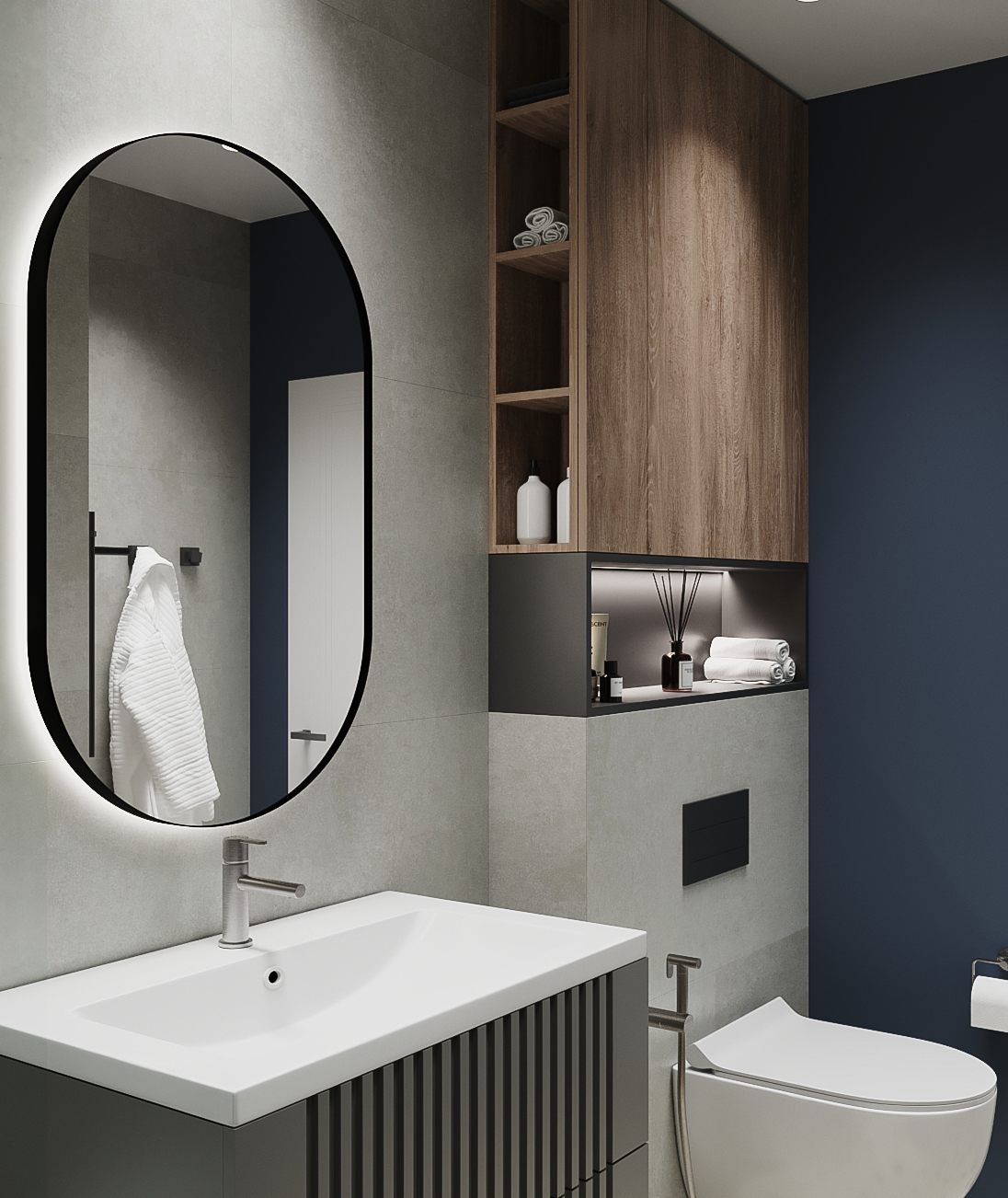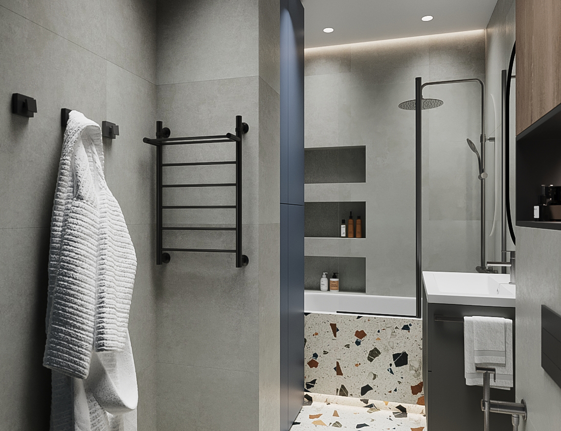 Этот проект был создан для холостяка, который ценит индустриальную эстетику и хотел добавить в свое пространство что-то неожиданное. Он мечтал о санузле, который отражал бы его характер: строгий, современный, но с изюминкой.