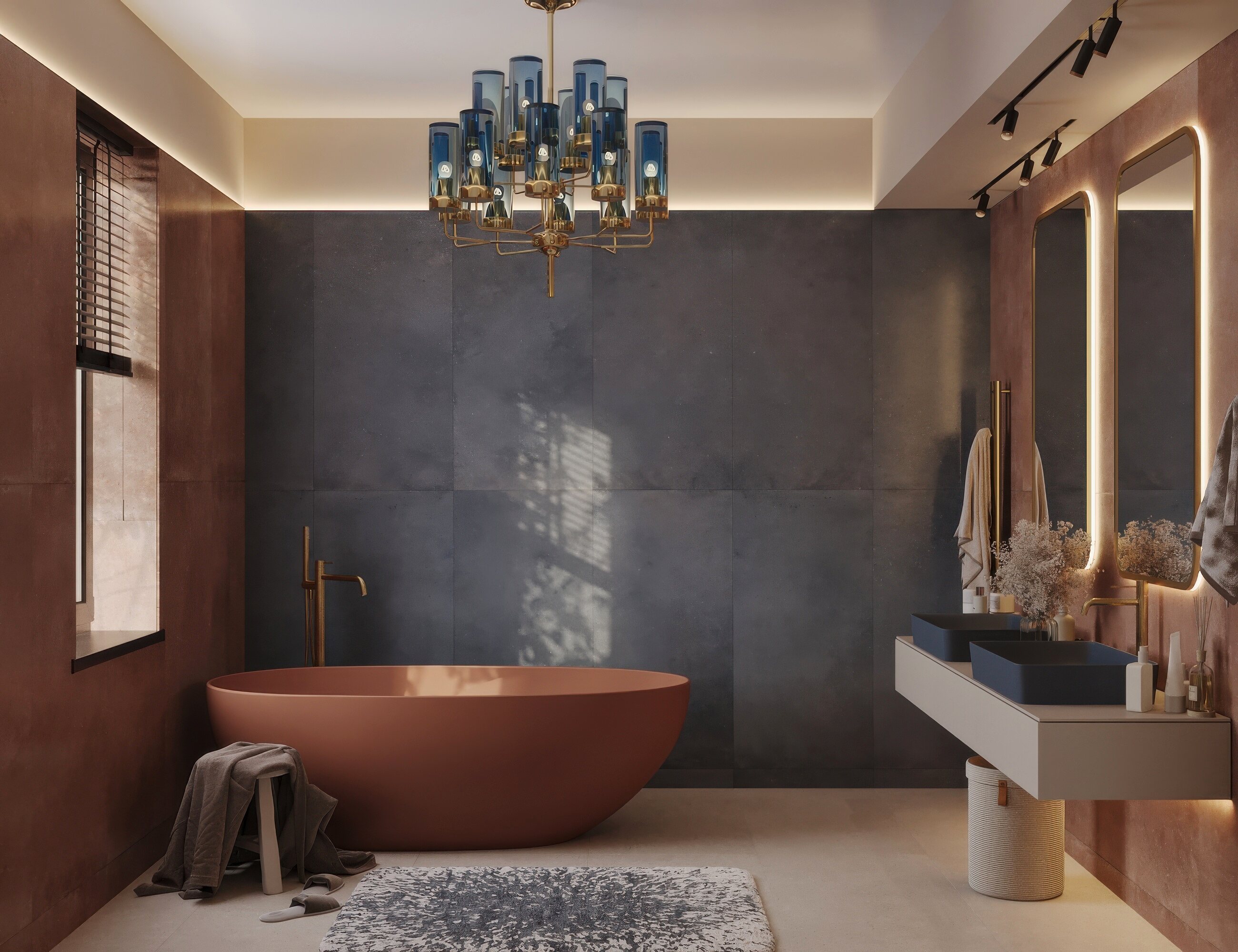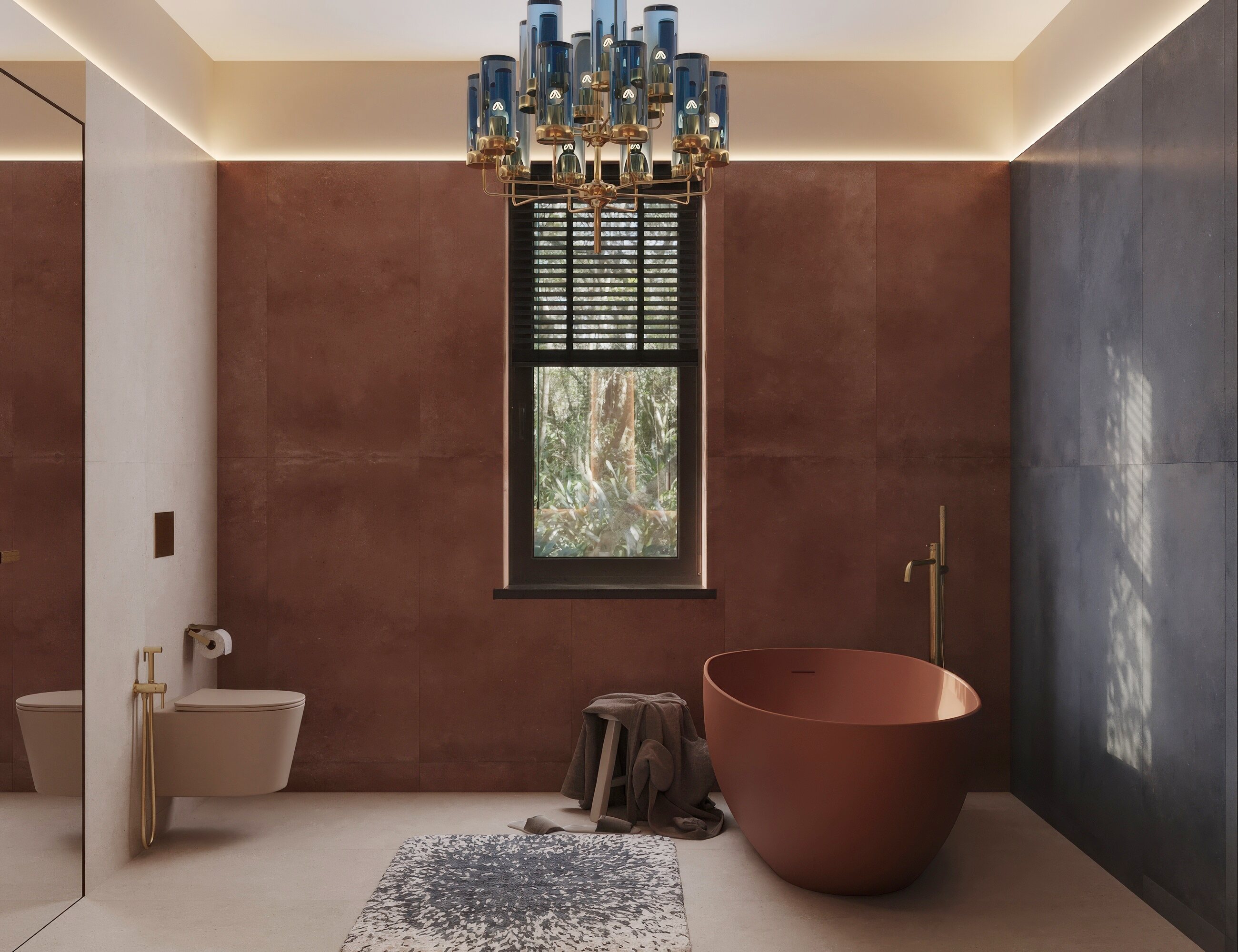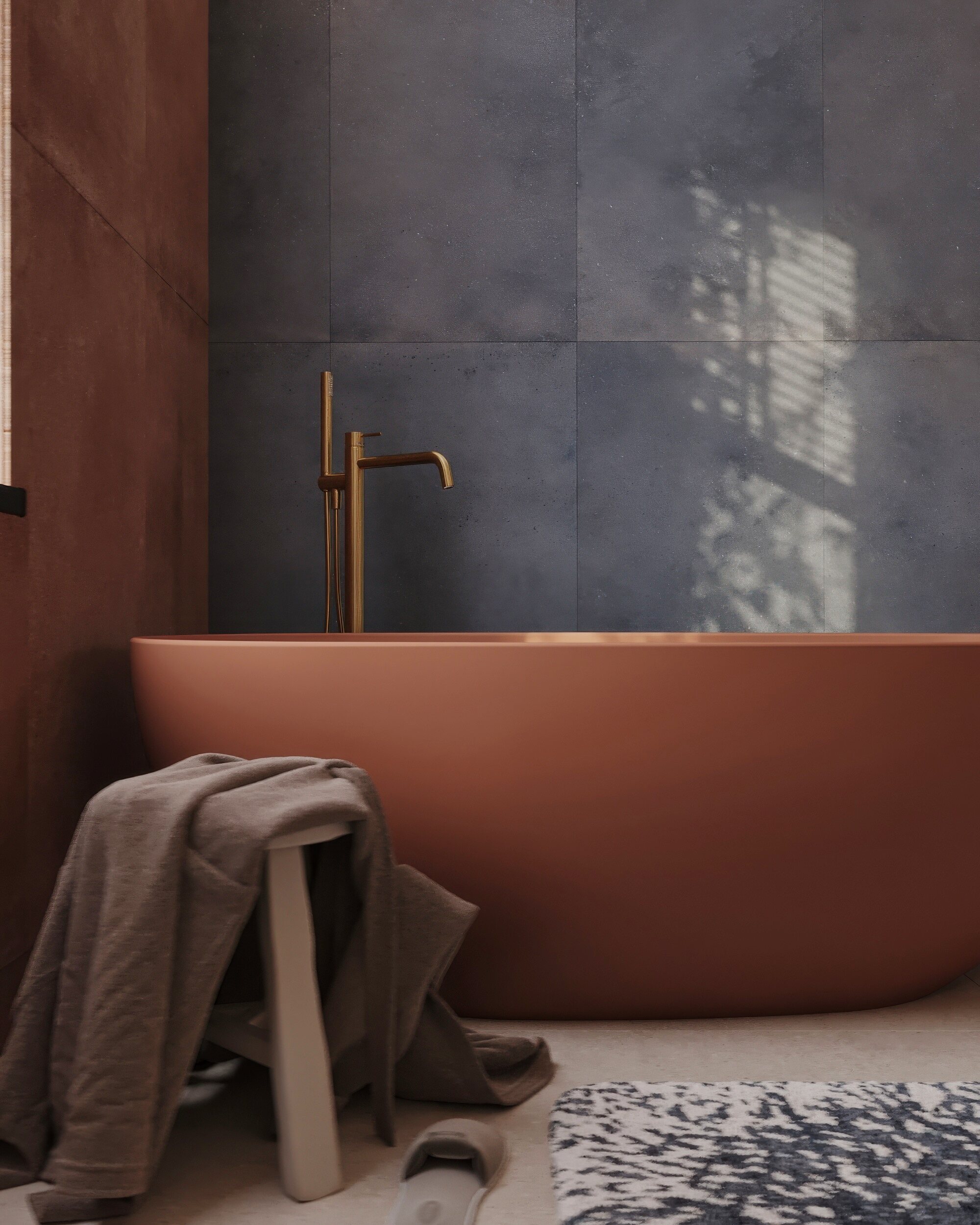 Мастер-санузел для молодой пары, стремящейся к смелым и нестандартным решениям. Основной концепцией стало сочетание двух ярких цветов, что было реализовано с помощью сантехники от Аквамира: отдельно стоящей ванны глубокого терракотового оттенка и выразительной синей раковины. Контрастная палитра гармонично дополняется бежевым унитазом, создавая сбалансированный цветовой ансамбль. Для усиления эффекта плитка была подобрана в тон сантехники, а акцентные элементы — смесители, кнопка смыва, напольный смеситель для ванны — выполнены в элегантном золотом цвете. Такое сочетание материалов и оттенков подчеркивает современный стиль интерьера, придавая пространству индивидуальность и глубину.
