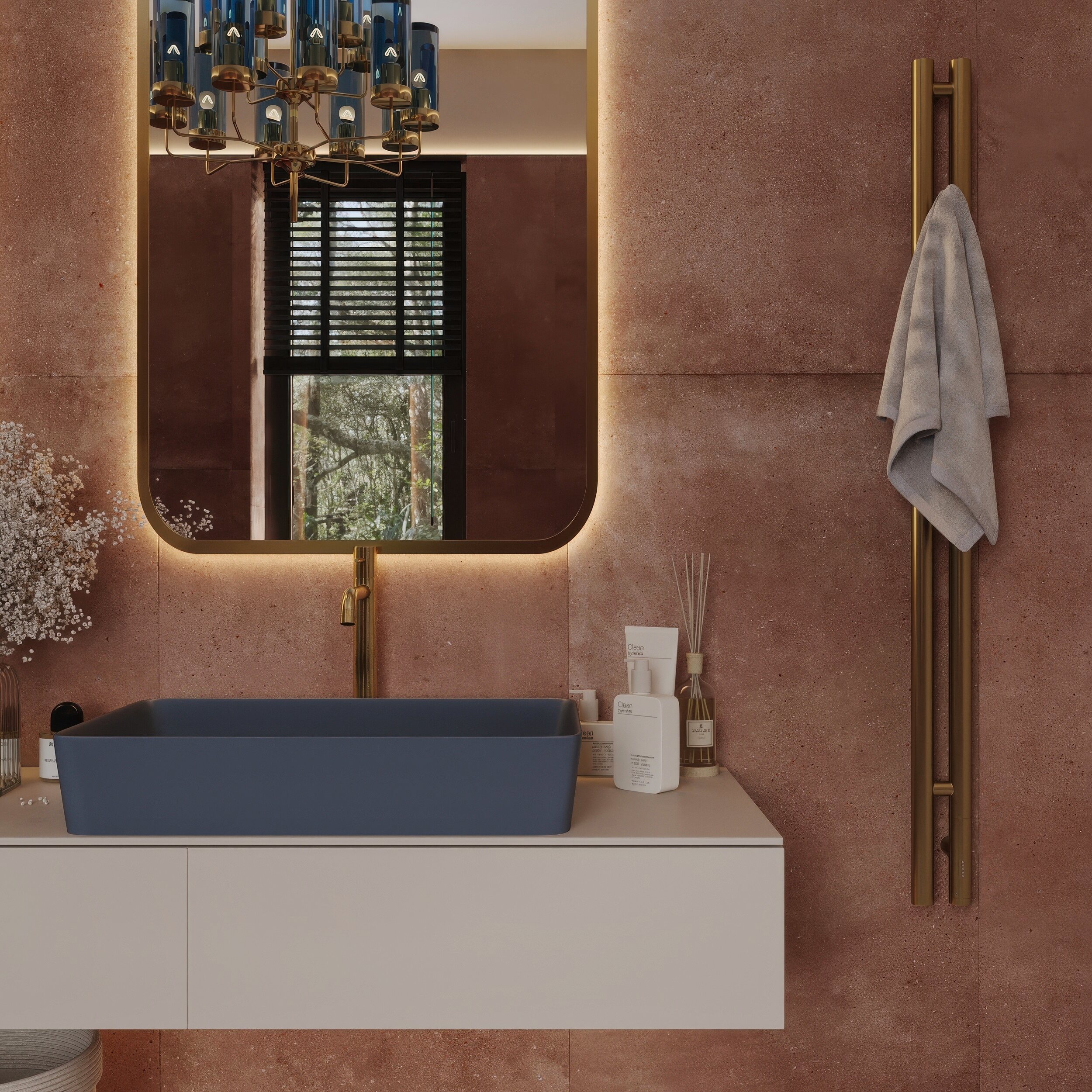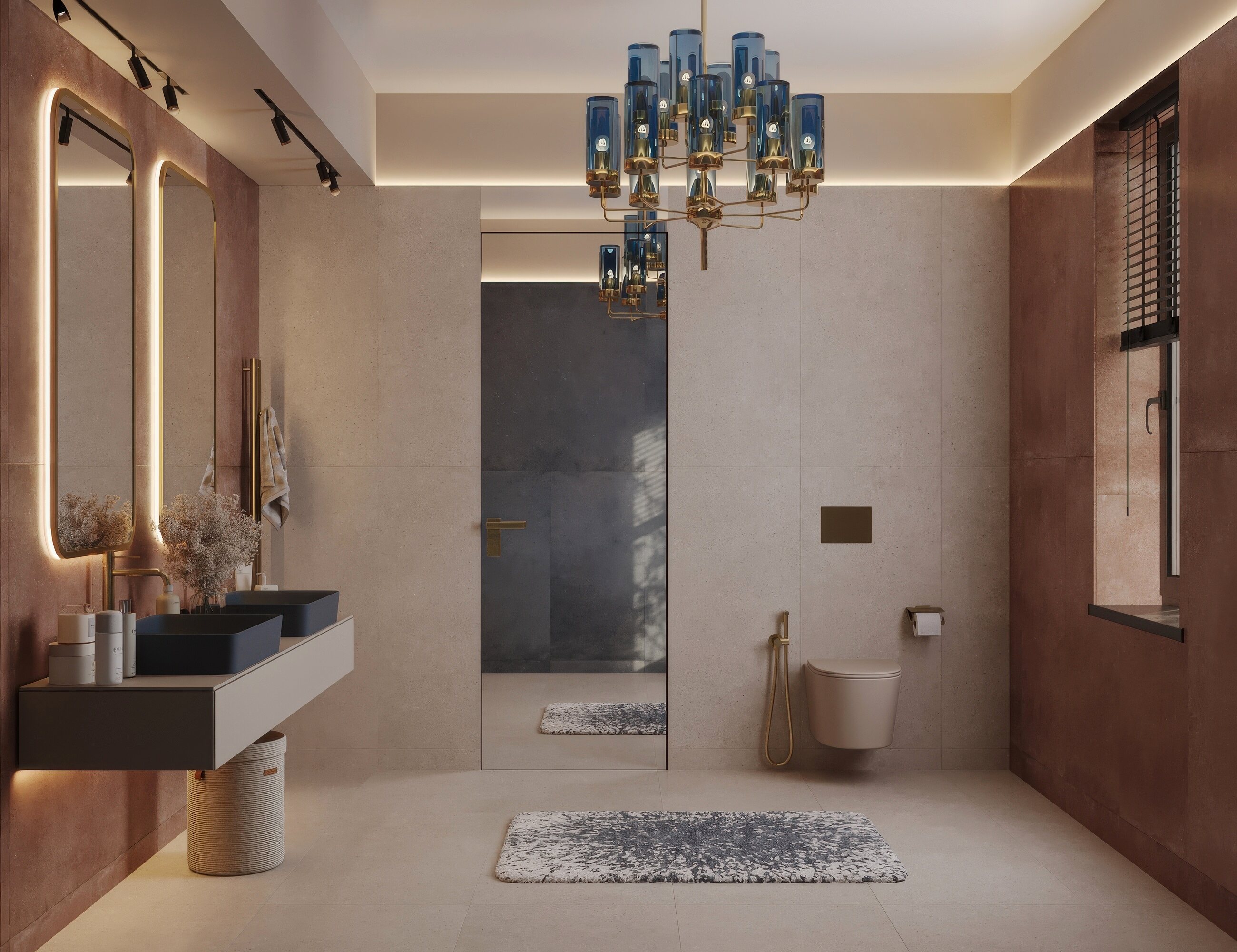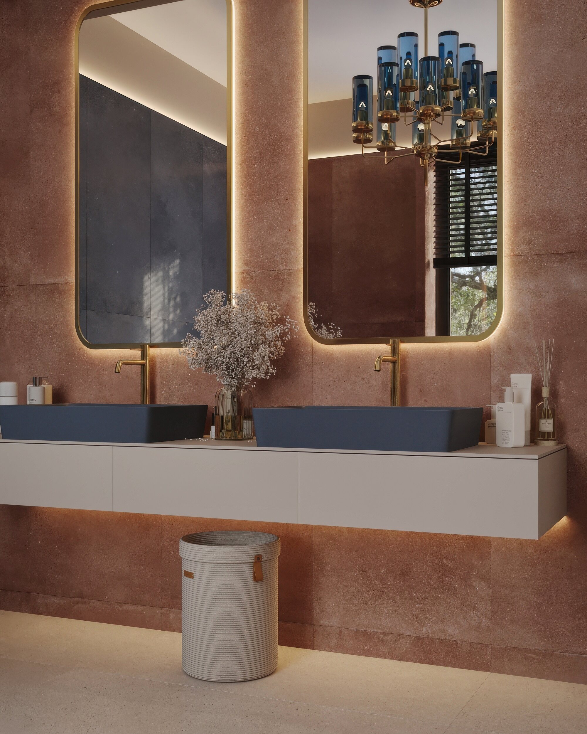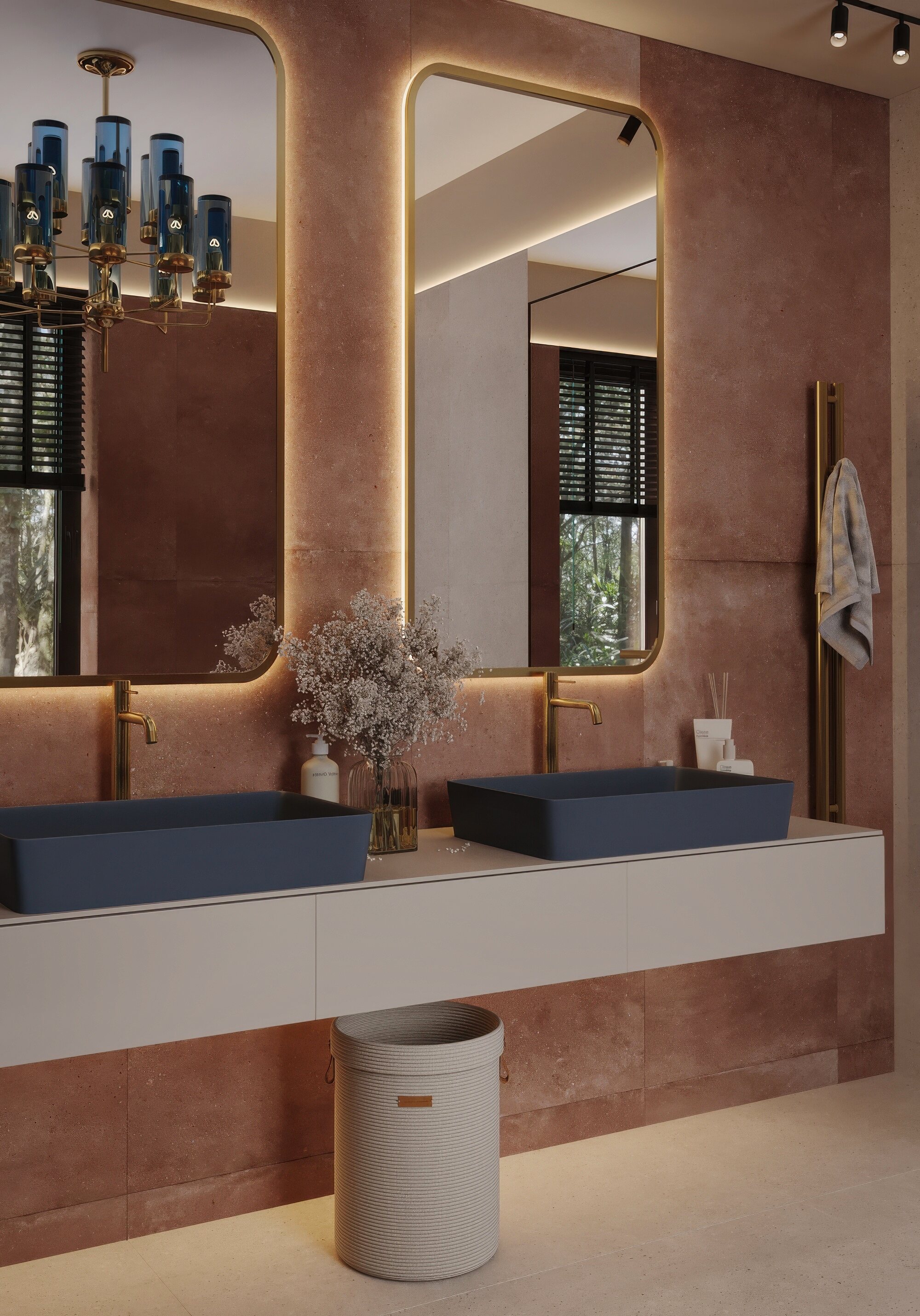 Мастер-санузел для молодой пары, стремящейся к смелым и нестандартным решениям. Основной концепцией стало сочетание двух ярких цветов, что было реализовано с помощью сантехники от Аквамира: отдельно стоящей ванны глубокого терракотового оттенка и выразительной синей раковины. Контрастная палитра гармонично дополняется бежевым унитазом, создавая сбалансированный цветовой ансамбль. Для усиления эффекта плитка была подобрана в тон сантехники, а акцентные элементы — смесители, кнопка смыва, напольный смеситель для ванны — выполнены в элегантном золотом цвете. Такое сочетание материалов и оттенков подчеркивает современный стиль интерьера, придавая пространству индивидуальность и глубину.
